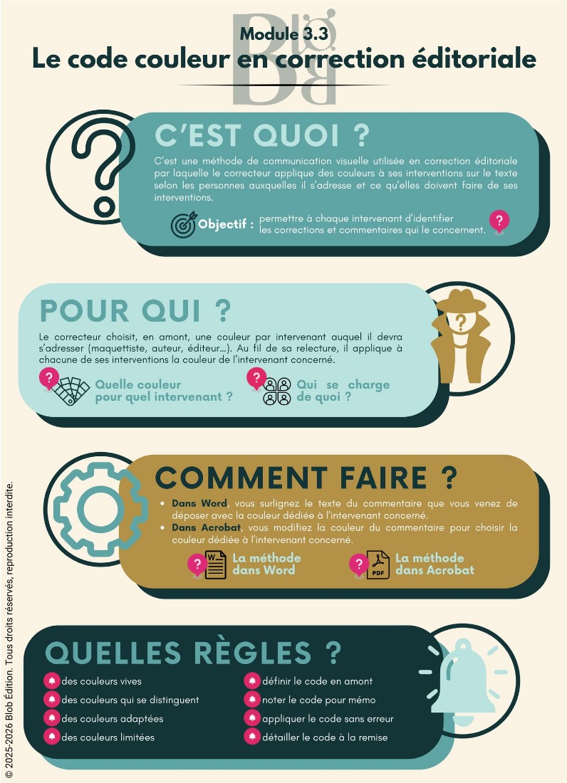 Dans la grande majorité des cas, vous utiliserez les couleurs préconisées dans le présent module. Mais, parfois, vous aurez à relire des ouvrages dont la maquette chargée (manuels scolaires, beaux livres, ouvrages jeunesse…) rend votre code couleur peu visible (certains commentaires pourront être quasiment invisibles selon leur couleur et le fond de page). N’hésitez pas, dans ces cas-là, à adapter le code couleur en amont de la mission : parcourez l’ouvrage et relevez-en les couleurs dominantes pour éviter de les utiliser dans votre code couleur.