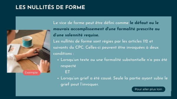 Le vice de forme peut être défini comme le défaut ou le mauvais accomplissement d'une formalité prescrite ou d’une solennité requise. Les nullités de forme sont régies par les articles 112 et suivants du CPC. Celles-ci peuvent être invoquées à deux conditions :- Lorsqu’un grief a été causé. Seule la partie ayant subie le grief peut l’invoquer.
