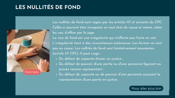 Le vice de fond est une irrégularité qui n'affecte pas l'acte en soit. L’irrégularité tient à des circonstances extérieures. Les formes ne sont pas en cause. Les nullités de fond sont limitativement énumérées (article 117 CPC). Il peut s’agir :