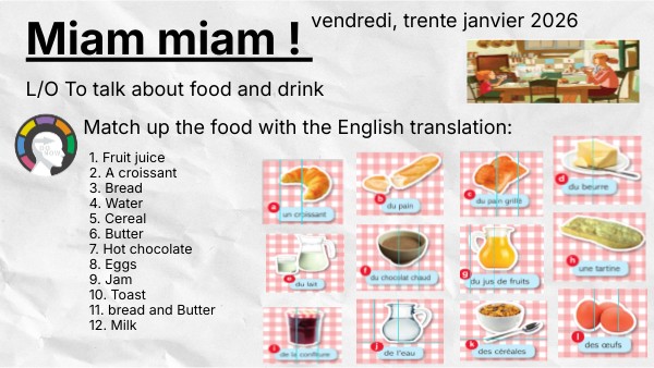 1. Fruit juice2. A croissant 3. Bread 4. Water 5. Cereal 6. Butter 7. Hot chocolate 8. Eggs 9. Jam 10. Toast 11. bread and Butter 12. Milk