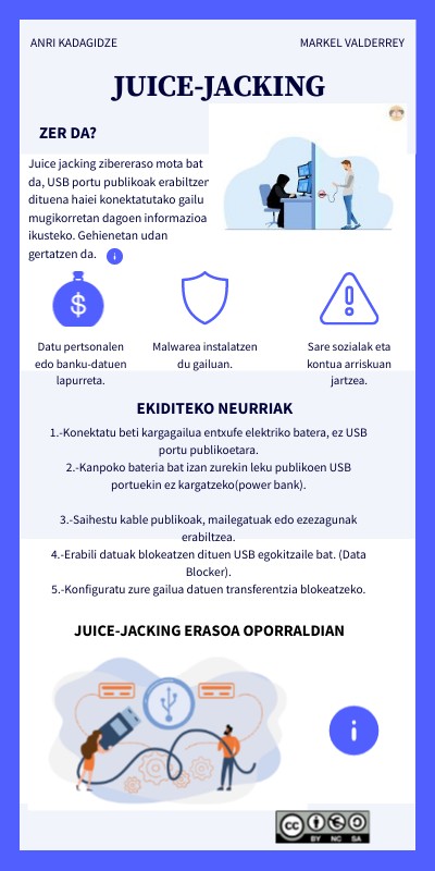 Oporraldietan, helburu nagusia bidaiatzea, erlaxatzea eta deskonektatzea da. Bidaiatzean ohikoa da telefono portu publikoetan kargatzea. USB portu publiko batera konektatuz gero, "juice jacking" izeneko eraso bat jaso ahal da. Juice jacking zibereraso mota bat da, USB portu publikoak erabiltzen dituena konektatutako gailu mugikorretan dagoen informazioa ikusteko. USB portu kaltetu batera konektatzea ez da telefonoa leku desegoki batean kargatzea bakarrik; ziberkriminalentzako sarrera-puntua ere izan daiteke. Hauek dira juice jacking-arekin lotutako arrisku nagusiak: -Datu pertsonalen edo banku-datuen lapurreta. -Malwarea instalatzen du gailuan. -Sare sozialak eta kontua arriskuan jartzea.