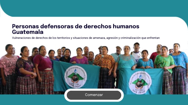 Desde el año 2017, , en colaboración con su socia local y con el apoyo del y la , acompaña, a través de diferentes proyectos, a comunidades campesinas e indígenas de los pueblos Ixil, Maya Q'eqchi', Maya Q'anjo b'al, Maya Poqomchi' y Maya Chortí, así como a jóvenes de barrios urbanos en los departamentos de Alta Verapaz, Huehuetenango, San Marcos, Santa Rosa, Guatemala, Petén y El Quiché, zonas de Guatemala donde se registran de manera sistemática vulneraciones de derechos territoriales, amenazas y procesos de criminalización. Este documento tiene por objeto visibilizar las vulneraciones de derechos de los territorios y las situaciones de amenaza, agresión y criminalización que enfrentan las personas defensoras, como estrategia de apoyo a su protección colectiva. Asimismo, busca sensibilizar a la ciudadanía global sobre la situación a la que se enfrentan.