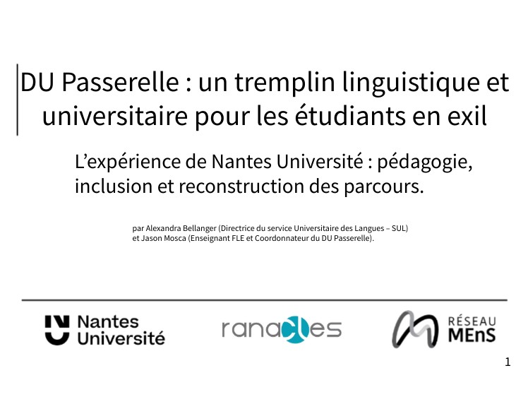 - Forte de son expérience de l’enseignement du FLE depuis 2007, en 2022 Nantes Université adhère au réseau MEnS et s’engage via la signature d’une charte commune aux 54 établissements à accompagner les étudiants en situation d’exil en proposant le DU Passerelle.