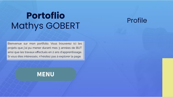 Bienvenue sur mon portfolio. Vous trouverez ici les projets que j'ai pu mener durant mes 3 années de BUT ainsi que les travaux effectués en 2 ans d'apprentissage. Si vous êtes intéressés, n'hésitez pas à explorer la page.