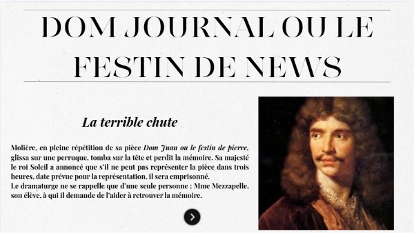 Pour cette activité, nous avons choisi la pièce Dom Juan ou le festin de pierre de Molière (1665) pour plusieurs raisons. Dans un premier temps, nous présentons un certain attachement pour le personnage éponyme. Celui-ci apporte en effet un esprit novateur au travers de ses argumentations et du courant libertin qu’il incarne malgré son manque de morale. De surcroît, l’écriture de cette œuvre est due à un évènement particulier : la censure multiple de la pièce Tartuffe ou l’imposteur (1664) de Molière. Le chef-d'œuvre du dramaturge possède donc une histoire qui la définie. Pour finir, cette pièce mélange deux grands courants littéraires scindant le XVIIème siècle : le Baroque et le Classicisme.Le titre Dom Juan ou le festin de pierre donne tout d’abord de l’importance au personnage éponyme. De plus, grâce au titre « Dom » (onomastique), nous pouvons déduire que le protagoniste est issu de la noblesse espagnole. Ensuite, le sous-titre fait référence à la fin de la pièce dans laquelle le libertin partage un repas avec une statue, allégorie du jugement divin. Celle-ci lui donne la mort, cependant, le maître de Sganarelle a choisi de tendre la main à la statue, déterminant donc son propre destin. Il s’agit donc d’une vengeance du dramaturge suite à la censure de la pièce Tartuffe ou l’imposteur. En ce qui concerne les autres lectures cursives, il était possible d’étudier Les fausses confidences de Marivaux (1737) ou encore Le mariage de Figaro ou la folle journée de Beaumarchais (1784). Cependant, Dom Juan ou le festin de pierre se rapprochait plus, de part son contexte, du Menteur de Corneille (1644) étudié en cours, que des autres œuvres caractérisés par le mouvement des Lumières. Cela nous permet donc d’approfondir d’avantage nos recherches. Deuxièmement, la pièce sélectionnée se démarque par sa genèse atypique (détaillée précédemment).