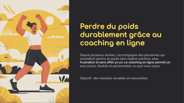 Depuis plusieurs années, j'accompagne des personnes qui souhaitent perdre du poids sans régime extrême, sans frustration et sans effet yo-yo. Le coaching en ligne permet un suivi précis, flexible et personnalisé, où que vous soyez.