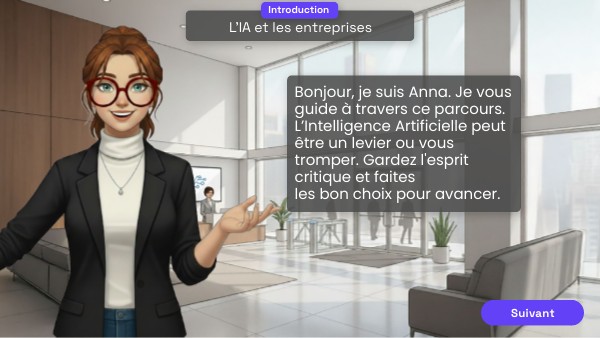 Bonjour, je suis Anna. Je vous guide à travers ce parcours. L’Intelligence Artificielle peut être un levier ou vous tromper. Gardez l'esprit critique et faites les bon choix pour avancer.