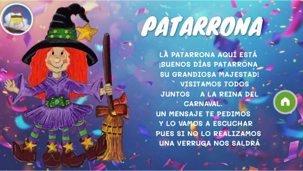 LA PATARRONA AQUÍ ESTÁ ¡BUENOS DÍAS PATARRONA SU GRANDIOSA MAJESTAD! VISITAMOS TODOS JUNTOS A LA REINA DEL CARNAVAL. UN MENSAJE TE PEDIMOS Y LO VAMOS A ESCUCHAR PUES SI NO LO REALIZAMOS UNA VERRUGA NOS SALDRÁ