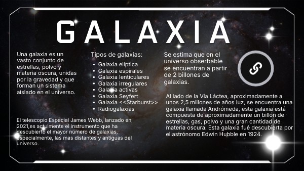 Al lado de la Vía Láctea, aproximadamente a unos 2,5 millones de años luz, se encuentra una galaxia llamada Andrómeda, esta galaxia está compuesta de aproximadamente un billón de estrellas, gas, polvo y una gran cantidad de materia oscura. Esta galaxia fué descubierta por el astrónomo Edwin Hubble en 1924.