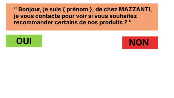 " Bonjour, je suis { prénom }, de chez MAZZANTI, je vous contacte pour voir si vous souhaitez recommander certains de nos produits ? "