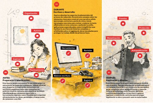 Esta última etapa te prepara para compartir tu obra con el público. Recoge información actualizada sobre certámenes literarios y sus convocatorias mensuales, guías completas sobre autopublicación y casos de éxito en plataformas como Amazon, opciones realistas para monetizar tu escritura y generar ingresos, y modelos de contratos para proteger legalmente tu obra y prevenir usos no autorizados.