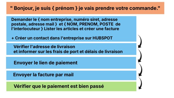 Demander le { nom entreprise, numéro siret, adresse postale, adresse mail } et { NOM, PRENOM, POSTE de l'interlocuteur } Lister les articles et créer une facture + Créer un contact dans l'entreprise sur HUBSPOT