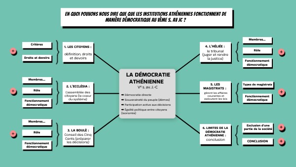 Institutions nombreuses et complémentaires => permet une certaine séparation des pouvoirs et limite les abus. Participation des citoyens au cœur du système. Les charges sont attribuées soit par le tirage au sort, soit par l’élection. => le pouvoir appartient réellement au peuple, qui débat, vote et contrôle les dirigeants. Ainsi, malgré ses limites la démocratie athénienne pose les bases et les principes essentiels de nos démocraties actuelles : la souveraineté du peuple, l’égalité devant la loi, la participation citoyenne, la séparation des pouvoirs