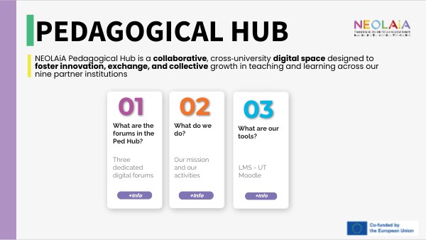 NEOLAiA Pedagogical Hub is a collaborative, cross‑university digital space designed to foster innovation, exchange, and collective growth in teaching and learning across our nine partner institutions