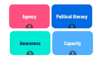 Capacity is about building the knowledge, skills, and confidence needed to participate actively in civic and political life. This might include developing communication and critical thinking skills, volunteering or joining local groups, or taking part in democratic processes such as elections.
