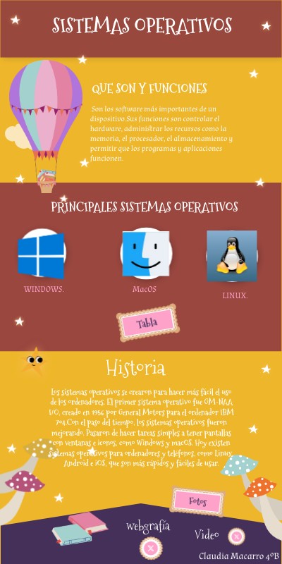 Los sistemas operativos se crearon para hacer más fácil el uso de los ordenadores. El primer sistema operativo fue GM-NAA I/O, creado en 1956 por General Motors para el ordenador IBM 704.Con el paso del tiempo, los sistemas operativos fueron mejorando. Pasaron de hacer tareas simples a tener pantallas con ventanas e iconos, como Windows y macOS. Hoy existen sistemas operativos para ordenadores y teléfonos, como Linux, Android e iOS, que son más rápidos y fáciles de usar.