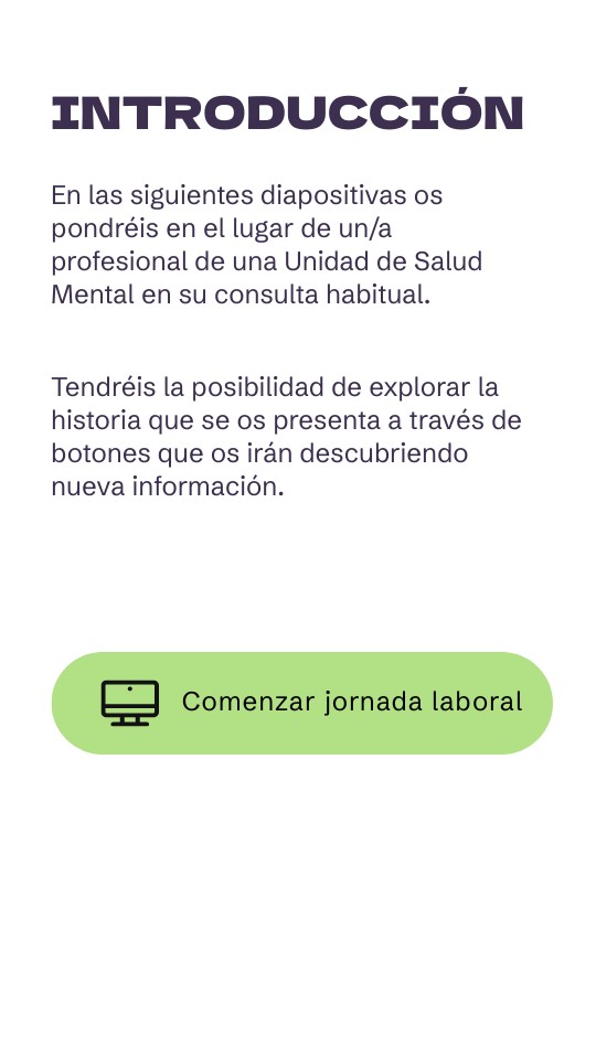 En las siguientes diapositivas os pondréis en el lugar de un/a profesional de una Unidad de Salud Mental en su consulta habitual. Tendréis la posibilidad de explorar la historia que se os presenta a través de botones que os irán descubriendo nueva información.