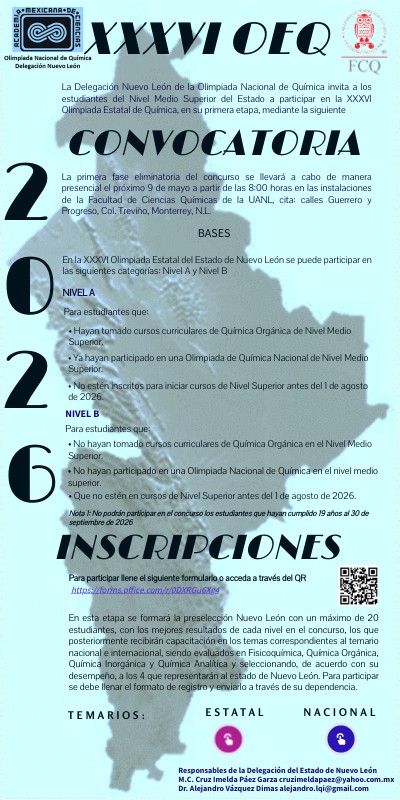 La Delegación Nuevo León de la Olimpiada Nacional de Química invita a los estudiantes del Nivel Medio Superior del Estado a participar en la XXXVI Olimpiada Estatal de Química, en su primera etapa, mediante la siguiente