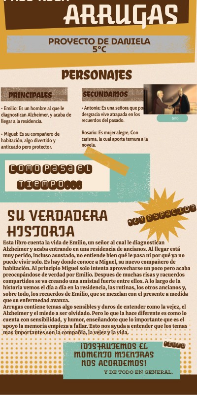 Esta libro cuenta la vida de Emilio, un señor al cual le diagnostican Alzheimer y acaba entrando en una residencia de ancianos. Al llegar está muy perido, incluso asustado, no entiende bien qué le pasa ni por qué ya no puede vivir solo. Es hay donde conoce a Miguel, su nuevo compañero de habitación. Al principio Miguel solo intenta aprovecharse un poco pero acaba preocupándose de verdad por Emilio. Despues de muchas risas y racuerdos compartidos se va creando una amistad fuerte entre ellos. A lo largo de la historia vemos el día a día en la residencia, las rutinas, los otros ancianos y, sobre todo, los recuerdos de Emilio, que se mezclan con el presente a medida que su enfermedad avanza.Arrugas contiene temas algo sensibles y duros de entender como la vejez, el Alzheimer y el miedo a ser olvidado. Pero lo que la hace diferente es como lo cuenta con sensibilidad, y humor, enseñandote que lo importante que es el apoyo la memoria empieza a fallar. Esto nos ayuda a entender que los temas mas importantes son la compañia, la vejez y la vida.
