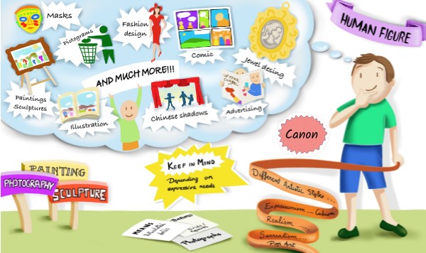 1. Sometimes the representation of the human figure is closely linked to religious beliefs. Figures are drawn with symbolic and exaggerated features. They are intended to represent characteristics such as divinity, evil, humanity, etc.