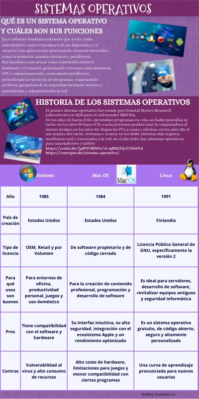 Es el software fundamentalmente que actúa como intermedario entre el hardware de un dispositivo y el usuario o las aplicaciones gestionando recursos esenciales como la memoria, almanecimientos y periféricos.Sus funciones son actuar como intermedio entre el hardware y el usuario, gestionando recursos como memoria, CPU y almacenamiento, controlando periféricos , permitiendo la ejecución de programas, organizando archivos, garantizando la seguridad mediante accesos y contraseñas, y administrando la red