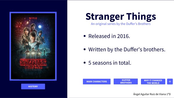 Hello, my name is... and I'm going to talk to you about this famous series called Stranger Things. First of all, I'd like to give you a brief overview of the series. It was created in 2016 by the Duffer brothers and has a total of five seasons, each consisting of eight or nine episodes, depending on the season. The story is set in the 1980s and is about a group of children who live in Hawkins, a town in Indiana, USA. One day, a boy named Will Byers disappears, and from there they begin to discover new secrets about this place. Among them is the Upside Down, a parallel dimension to this dark and dangerous town. Now I would like to talk about the main characters, who are... The Duffer brothers are American twin film directors who have had many successes, such as Stranger Things. Now, I would like to talk about why this series changed the world. The first reason is because I consider it a world-famous series. In addition, it was sponsored by 2026 in Spain, making it a historic milestone in the history of cinema. Finally, it featured large events with large crowds. To conclude, I would like to talk about how it revived many musical classics. The songs... were very well known in their day but were lost over the years. This series brought them back to life all over the world.