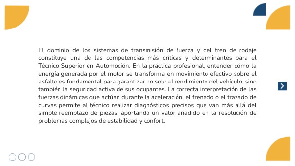 El dominio de los sistemas de transmisión de fuerza y del tren de rodaje constituye una de las competencias más críticas y determinantes para el Técnico Superior en Automoción. En la práctica profesional, entender cómo la energía generada por el motor se transforma en movimiento efectivo sobre el asfalto es fundamental para garantizar no solo el rendimiento del vehículo, sino también la seguridad activa de sus ocupantes. La correcta interpretación de las fuerzas dinámicas que actúan durante la aceleración, el frenado o el trazado de curvas permite al técnico realizar diagnósticos precisos que van más allá del simple reemplazo de piezas, aportando un valor añadido en la resolución de problemas complejos de estabilidad y confort.