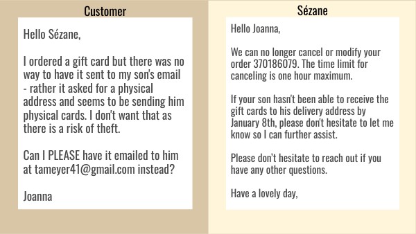 Hello Sézane, I ordered a gift card but there was no way to have it sent to my son's email - rather it asked for a physical address and seems to be sending him physical cards. I don't want that as there is a risk of theft. Can I PLEASE have it emailed to him at tameyer41@gmail.com instead? Joanna