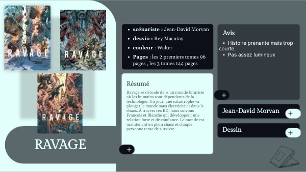 Ravage se déroule dans un monde futuriste où les humains sont dépendants de la technologie. Un jour, une catastrophe va plonger le monde sans électricité et dans le chaos. À travers ces BD, nous suivons Francois et Blanche qui développent une relation forte et de confiance. Le monde est maintenant en plein chaos et chaque personne tente de survivre.