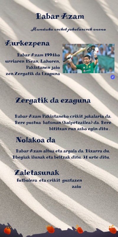 Babar Azam Pakistaneko crikit jokalaria da. Bere postua batsman (kolpetzailea) da. Bere bititzan run asko egin ditu .