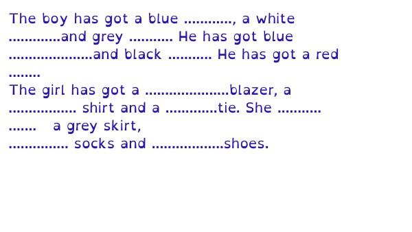 The boy has got a blue ............, a white .............and grey ........... He has got blue .....................and black ........... He has got a red ........ The girl has got a .....................blazer, a ................. shirt and a .............tie. She ........... ....... a grey skirt, ............... socks and ..................shoes.