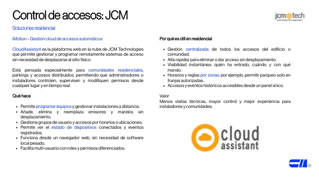 iMotion – Gestión cloud de accesos automáticos CloudAssistant es la plataforma web en la nube de JCM Technologies que permite gestionar y programar remotamente sistemas de acceso sin necesidad de desplazarse al sitio físico. Está pensada especialmente para comunidades residenciales, parkings y accesos distribuidos, permitiendo que administradores o instaladores controlen, supervisen y modifiquen permisos desde cualquier lugar y en tiempo real. Qué hace