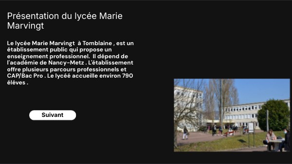 Le lycée Marie Marvingt à Tomblaine , est un établissement public qui propose un enseignement professionnel. Il dépend de l'académie de Nancy-Metz . L'établissement offre plusieurs parcours professionnels et CAP/Bac Pro . Le lycéé accueille environ 790 éléves .