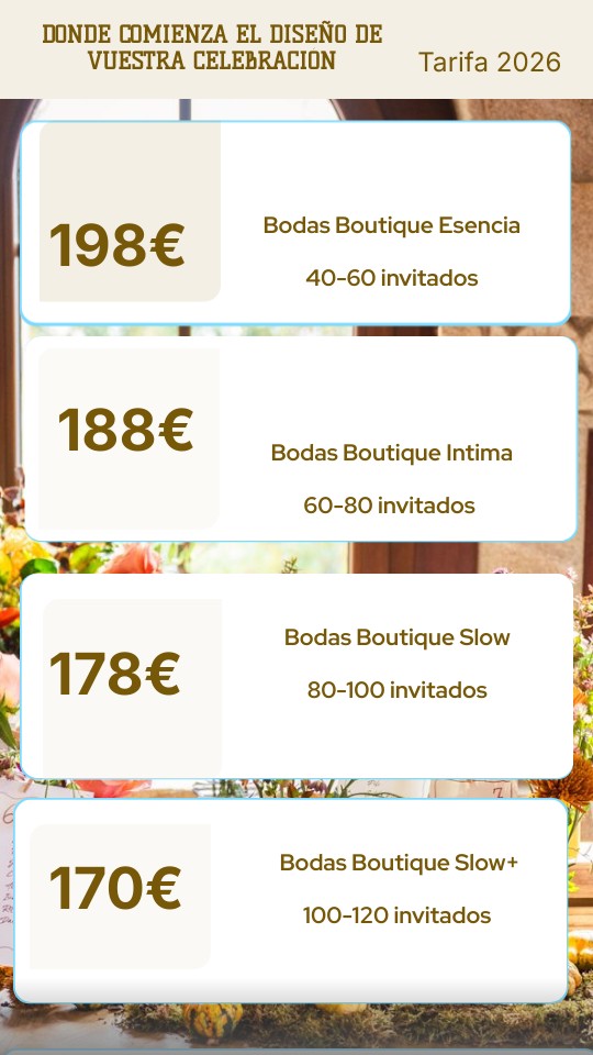 Suplementos de Menú Menú 2 y Menú 3 · +26 € por asistente Menú Cóctel · +12 € por asistente Si deseáis personalizar vuestro menú o explorar otras opciones, estaremos encantados de escuchar vuestras ideas y crear una propuesta a medida.