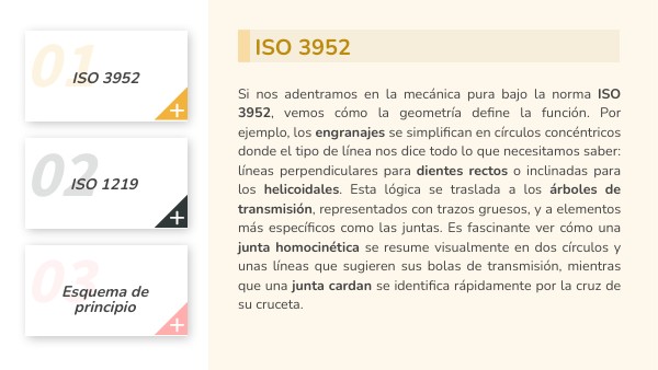 Si nos adentramos en la mecánica pura bajo la norma ISO 3952, vemos cómo la geometría define la función. Por ejemplo, los engranajes se simplifican en círculos concéntricos donde el tipo de línea nos dice todo lo que necesitamos saber: líneas perpendiculares para dientes rectos o inclinadas para los helicoidales. Esta lógica se traslada a los árboles de transmisión, representados con trazos gruesos, y a elementos más específicos como las juntas. Es fascinante ver cómo una junta homocinética se resume visualmente en dos círculos y unas líneas que sugieren sus bolas de transmisión, mientras que una junta cardan se identifica rápidamente por la cruz de su cruceta.