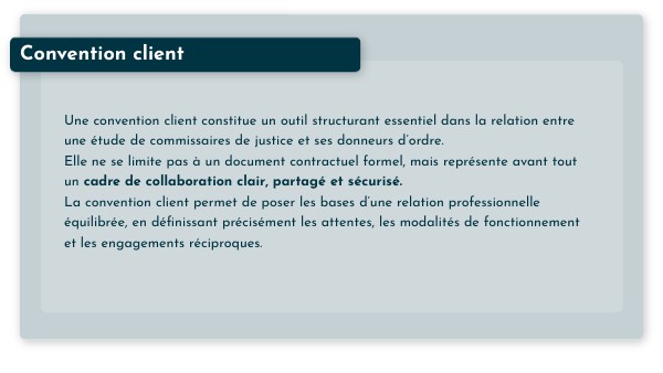 Dans un environnement juridique fortement normé, où les procédures sont encadrées et les responsabilités importantes, la convention client joue un rôle de clarification.