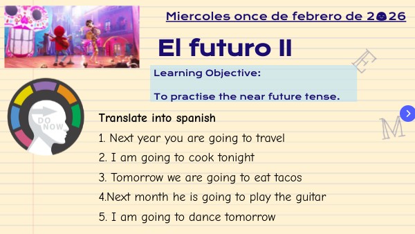 Translate into spanish 1. Next year you are going to travel 2. I am going to cook tonight 3. Tomorrow we are going to eat tacos 4.Next month he is going to play the guitar 5. I am going to dance tomorrow