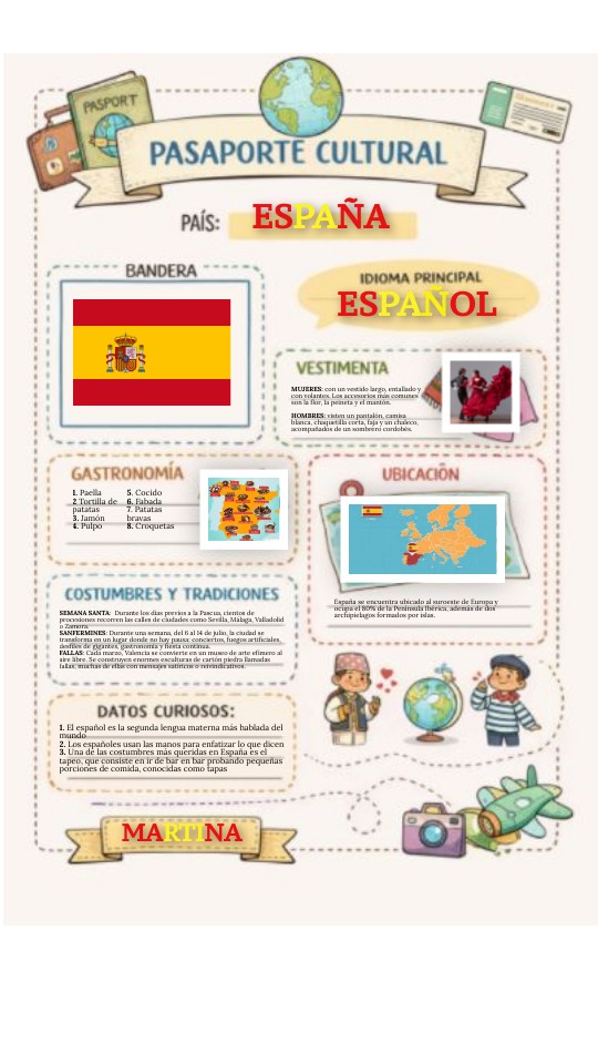 1. El español es la segunda lengua materna más hablada del mundo2. Los españoles usan las manos para enfatizar lo que dicen 3. Una de las costumbres más queridas en España es el tapeo, que consiste en ir de bar en bar probando pequeñas porciones de comida, conocidas como tapas