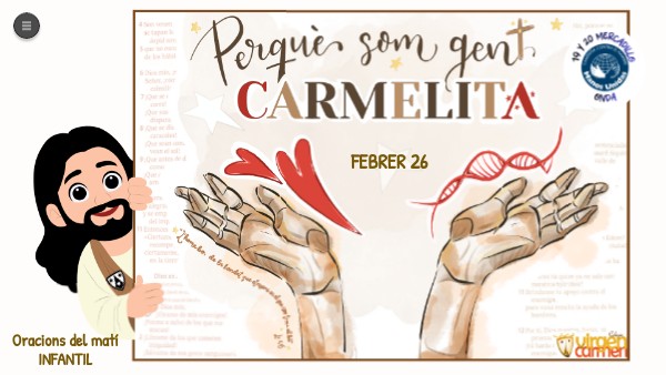 Perquè som genT carmelita, Senyor, agraïm tots els animals que has posat al nostre costat, regal de la teua bondat. Perquè som genT carmelita, volem cuidar la creació, estimant i respectant cada ésser viu que tu has creat. Perquè som genT carmelita, ens comprometem a no fer mal als animals, sinó a tractar-los amb tendresa i responsabilitat. Perquè som genT carmelita, et donem gràcies per les mascotes que ens fan companyia i per tots els animals que ajuden les persones a viure millor. Perquè som genT carmelita, et demanem que beneïxes hui tots els animals, especialment els que estan malalts, abandonats o patint. Perquè som genT carmelita, volem aprendre de Sant Antoni Abat a viure senzills, generosos i amics de tota la creació. Perquè som genT carmelita, que la nostra escola siga casa d’acollida, de respecte i de cura per les persones i pels animals. Amén.