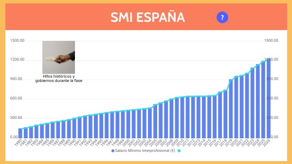 - 2019: Se aprobó la mayor subida interanual de la historia, incrementando el SMI un 22,3%, pasando de 735,90 € a 900 € al mes (en 14 pagas). PSOE