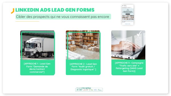 PHASE 1 : Générer du trafic qualifié Objectif LinkedIn Ads : "Visites du site web" Annonce : 🚛 Besoin d'un prestataire logistique qui vous comprend vraiment ? Le Roy Logistique : transport, logistique, copacking en un seul partenaire. ✅ Solutions sur-mesure ✅ Accompagnement Business Solutions personnalisé ✅ Réseau national, ancrage local 👉 Découvrez nos solutions PHASE 2 : Retargeting Grâce au LinkedIn Insight Tag (installé sur notre site), il faudra créer des audiences de retargeting : Personnes ayant visité la landing page mais pas rempli le formulaire Personnes ayant visité page "Transport" ou "Logistique" → Les re-ciblez avec une 2ème campagne plus directe : "Vous avez consulté nos solutions logistiques. Échangeons sur vos besoins : [CTA]"