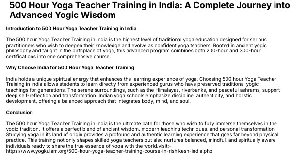 Introduction to 500 Hour Yoga Teacher Training in India The 500 hour Yoga Teacher Training in India is the highest level of traditional yoga education designed for serious practitioners who wish to deepen their knowledge and evolve as confident yoga teachers. Rooted in ancient yogic philosophy and taught in the birthplace of yoga, this advanced program combines both 200-hour and 300-hour certifications into one comprehensive course. Why Choose India for 500 Hour Yoga Teacher Training India holds a unique spiritual energy that enhances the learning experience of yoga. Choosing 500 hour Yoga Teacher Training in India allows students to learn directly from experienced gurus who have preserved traditional yogic teachings for generations. The serene surroundings, such as the Himalayas, riverbanks, and peaceful ashrams, support deep self-reflection and transformation. Indian yoga schools emphasize discipline, authenticity, and holistic development, offering a balanced approach that integrates body, mind, and soul. Conclusion The 500 hour Yoga Teacher Training in India is the ultimate path for those who wish to fully immerse themselves in the yogic tradition. It offers a perfect blend of ancient wisdom, modern teaching techniques, and personal transformation. Studying yoga in its land of origin provides a profound and authentic learning experience that goes far beyond physical practice. This training not only shapes skilled yoga teachers but also nurtures balanced, mindful, and spiritually aware individuals ready to share the true essence of yoga with the world.visit:- https://www.yogkulam.org/500-hour-yoga-teacher-training-course-in-rishikesh-india.php