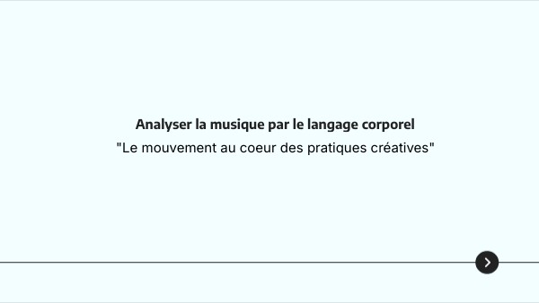 Donner à voir la musique par le mouvement, en mobilisant le corps comme espace d’écoute, de compréhension et de création Interpréter les éléments musicaux (rythme, mélodie, phrasé, dynamique, forme, les contrastes) en gestes, déplacements et postures Lâcher-prise et mémoriser corporellement, des leviers essentiels de la créativité S’appuyer sur des approches telles que la rythmique de Dalcroze, l’analyse du mouvement chez Laban et l’improvisation corporelle pour laisser émerger une compréhension sensible et intuitive de la musique Transposer les matériaux corporels issus de l’écoute musicale sont réinvestis dans des situations plus abstraites