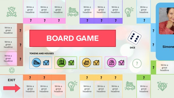 Each player must choose a color: blue, green, yellow, or pink. This gives them a token to mark their position and 10 houses to indicate the properties they acquire throughout the game. Each player must take their colored token and place it on the starting space. To start playing, click on the dice and move your token to the corresponding space. On each space, there must be one or more questions. If you answer correctly, place one of your houses on that space. Congratulations, you have acquired a new property! Special spaces: spaces with icons may contain penalties such as "The player pays light taxes: loses 2 houses". Answer the question correctly to avoid the penalty! The player who has the most houses on the board once all spaces are occupied will win.