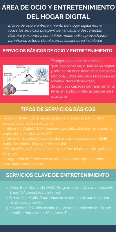 • Radio FM/AM/DAB: Señal captada por antenas DAT o FM y decodificada para su escucha.• Televisión Digital (TDT): Requiere decodificador interno o externo; captación por antenas de ICT. • Televisión Satélite/Cable: Satélite mediante parabólica y LNB; cable sin antena, llega por red coaxial. • Música Online: Acceso a bases de datos del proveedor, gratuita o de pago. • Juegos Online: Funcionan desde navegador o app, en modo individual o multijugador.