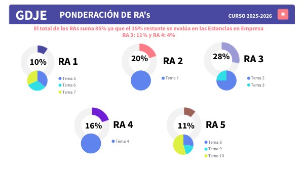La línea muestra el peso % de cada unidad a lo largo del curso. Al inicio del curso se trabajan los RA con mayor peso.