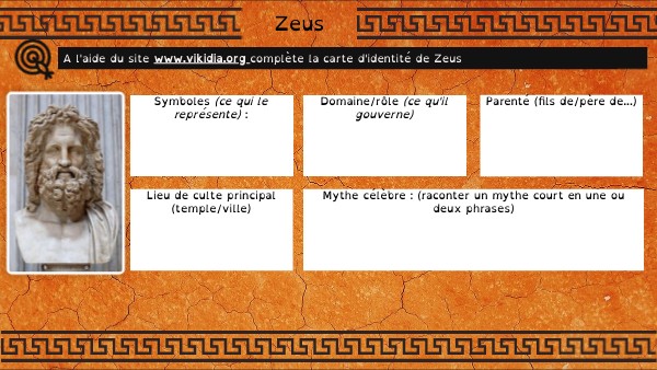 A l'aide du site www.vikidia.org complète la carte d'identité de Zeus