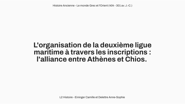 I. Une alliance avant tout stratégique : le retour en puissance d’Athènes a. Une alliance qui permet à Athènes de sortir de l’isolement diplomatique né de 404 b. Une coopération militaire qui contribue à un rééquilibrage stratégique en mer Égée II. La démocratie et l’usage de symbole comme outil et vitrine diplomatique a. Des procédures démocratiques qui sont mises en scène dans la conclusion de l’alliance b. Un accord qui présente l’alliance comme un engagement volontaire et contractuel III. Une influence athénienne qui demeure réelle mais limitée dans ses ambitions hégémoniques a. Un cadre géopolitique imposé par la Paix du Roi qui place les Perses en position d’arbitres (surveillance externe) b. Un ordre intergrec qui est encadré par Sparte en tant que relais de la domination perse (surveillance régionale)