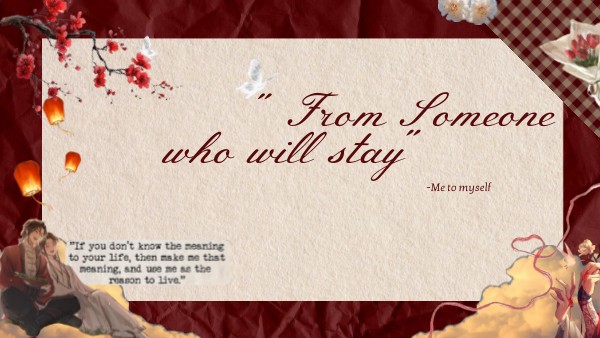 This card is inspired by a story called "Tian Guan Ci Fu(Heaven Official's blessing-donghua and chinese novel)", which has the themes of devotion, loyalty, and care between two characters. I chose this story because it has the idea of support in the same way we can show love and kindness to ourselves. The quotes I included capture moments of reflection, devotion, and strength, which I wanted to show in my card. Even if you don’t know the story, these lines are meant to inspire thought about self-love and the power of staying kind.