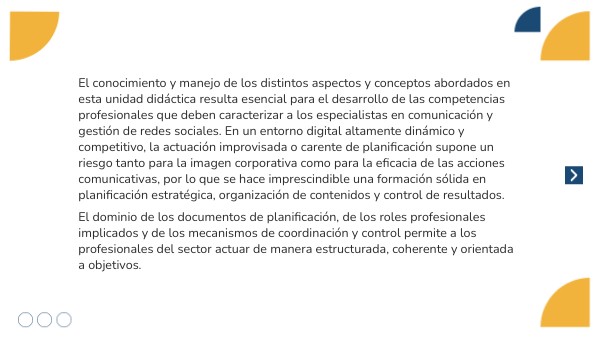 El conocimiento y manejo de los distintos aspectos y conceptos abordados en esta unidad didáctica resulta esencial para el desarrollo de las competencias profesionales que deben caracterizar a los especialistas en comunicación y gestión de redes sociales. En un entorno digital altamente dinámico y competitivo, la actuación improvisada o carente de planificación supone un riesgo tanto para la imagen corporativa como para la eficacia de las acciones comunicativas, por lo que se hace imprescindible una formación sólida en planificación estratégica, organización de contenidos y control de resultados.